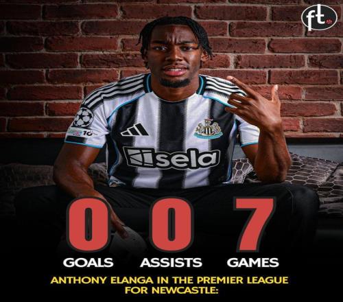 值得一提的是,埃兰加在加盟纽卡斯尔联后的前7场英超比赛中,尚未参与任何进球。