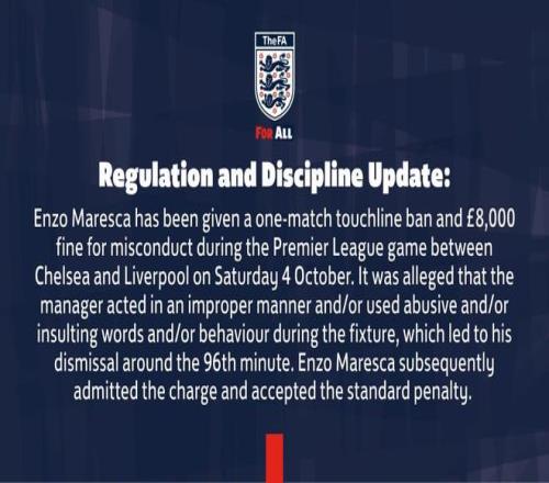 英足总官方如今表示,马雷斯卡在比赛当中存在不当行为或使用侮辱性语言,也因此导致他在第96分钟被罚出场。马雷斯卡本人已承认自己的行为,并接受处罚。