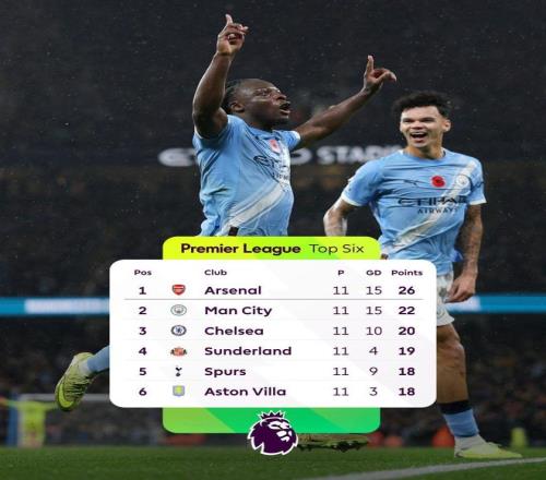 目前,英超陷入“大乱战”状态。阿森纳26分领跑,曼城22分第2,切尔西20分第3,桑德兰19分第4。