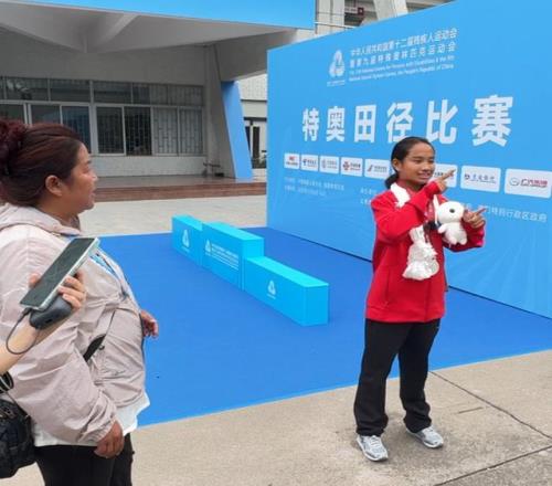 一天的赛程接近尾声。顿珠卓玛在女子12-15岁组50米中获得了银牌。颁奖仪式过后,她在检录处高兴地打着手语,飞舞的双手,将藏不住的喜悦悄然传递。