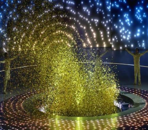 残奥会圣火穿越意大利后进入竞技场,表演者们象征性地“抓住”了火炬的光芒,将火炬在他们手中传递,然后“点燃”圣火。被“点燃”的圣火,主要由光和亮片组成火的象征效果,将整个竞技场变成了一个巨大的残奥会圣火盆。