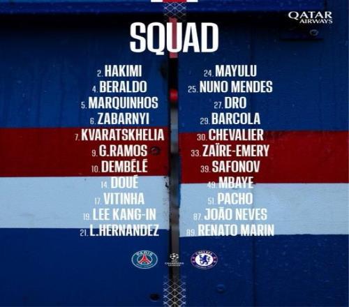 前锋:7-克瓦拉茨赫利亚、9-贡萨洛-拉莫斯、10-登贝莱、14-杜埃、27-德罗-费尔南德斯、29-巴尔科拉、49-姆巴耶