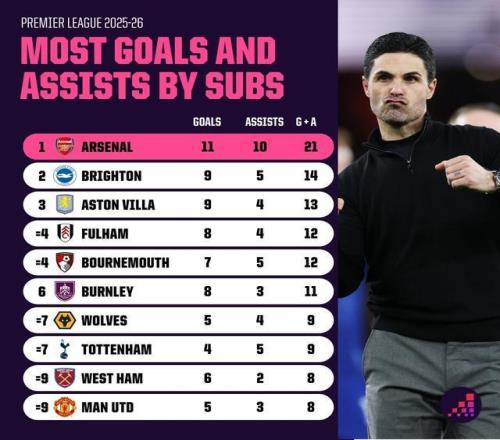 Opta列出了本赛季英超球队替补球员参与进球榜,阿森纳以21球居首,领先第二名的布莱顿7球。