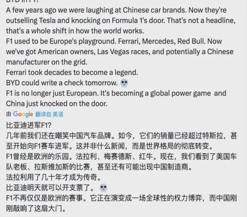 有意思的是,相比起国内网友纷纷从现实层面反驳比亚迪进军F1的可能性,国外的舆论环境却完全是另一种情况。