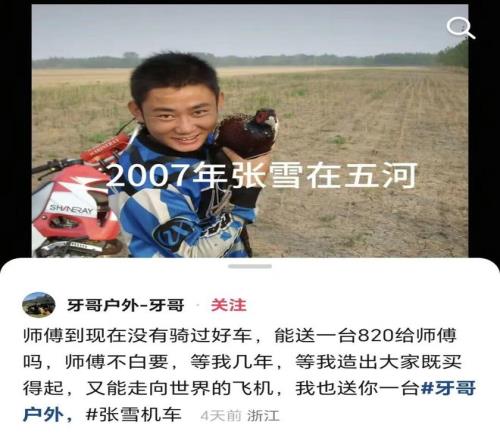 夺冠后不久,牙哥发视频配文喊话张雪:“没骑过好车,能送一台820给师父吗?”